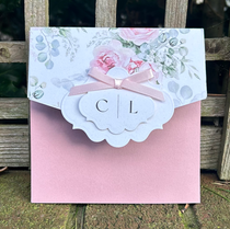 Classic and elegant design using pearlescent embossed paper, satin ribbon and luxurious embellishment. Colours can be changed.